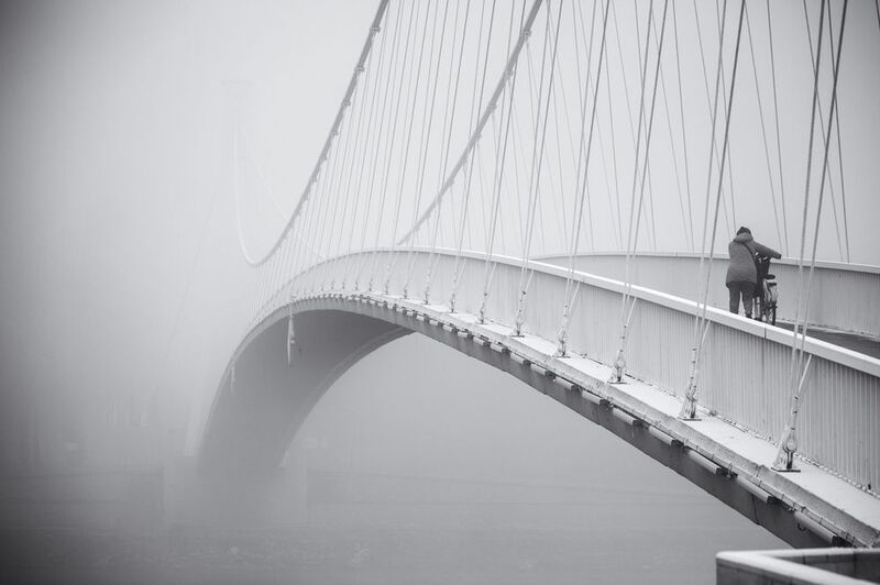 An older woman strolls beneath the spider sculpture known as Maman. Its imposing legs evoke both maternal protection and a quiet threat, framing the everyday scene unfolding below. The moment captures how public art intersects with real life, blending symbolism and ordinary movement into one compelling frame.