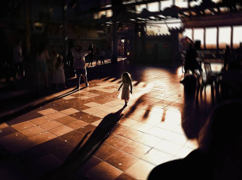 This image captures the lively scene of children caught in a water frenzy, as they dash across a platform with water jets streaming from the ground. Backlit by a setting sun, their silhouettes are dramatically outlined against the shimmering reflections, adding a dynamic energy to the scene.