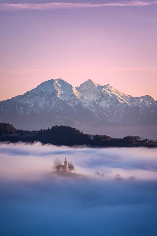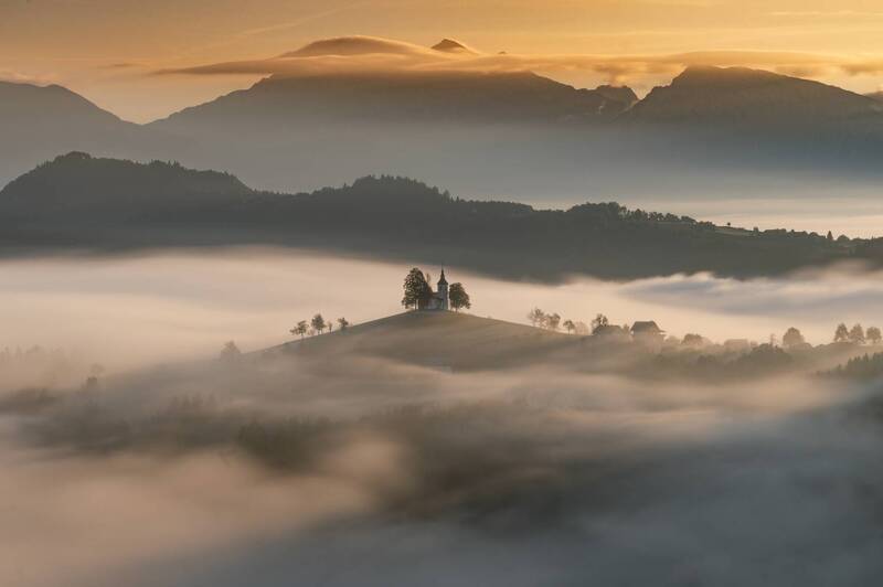 As the first rays of dawn grace the earth, they cast a warm, golden hue upon the tranquil scene of a church nestled atop a gentle hill. Captured in the embrace of morning mist, the layers of fog create an ethereal backdrop, adding depth and mystery to the landscape.