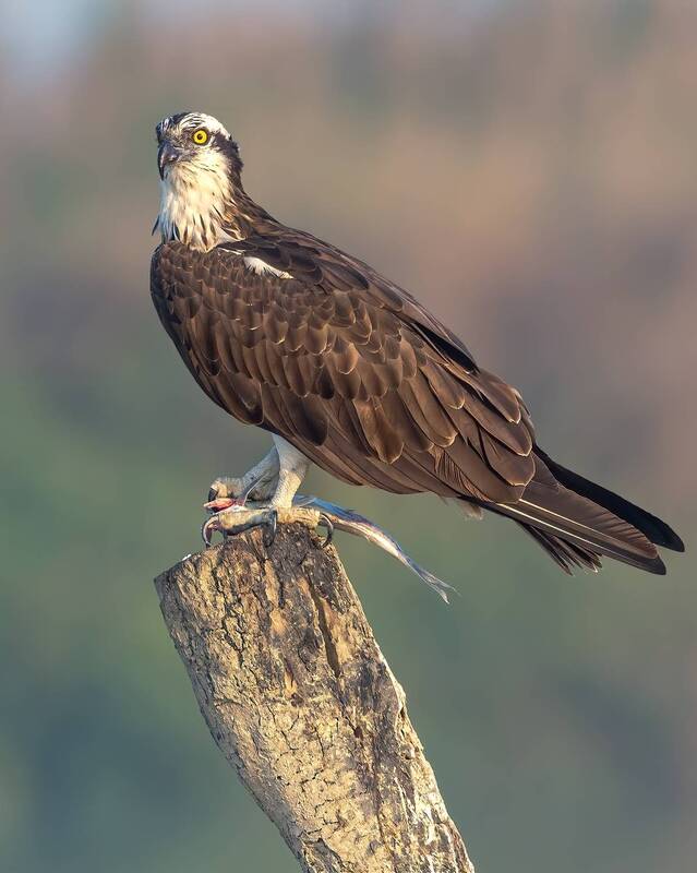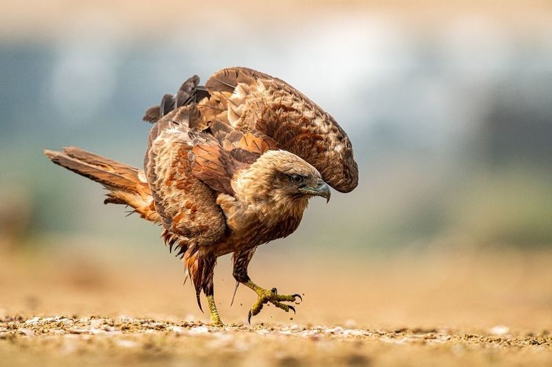 This stunning image captures a bird of prey, possibly a hawk or a buzzard, in a powerful stance. With its wings slightly raised and talons poised, the raptor appears focused, exuding both grace and strength. The intricate details of its feathers, sharp gaze, and earthy tones blend seamlessly with the blurred natural background, emphasizing its presence as a skilled hunter in the wild. The photograph beautifully highlights the raw beauty and intensity of nature\'s predators.