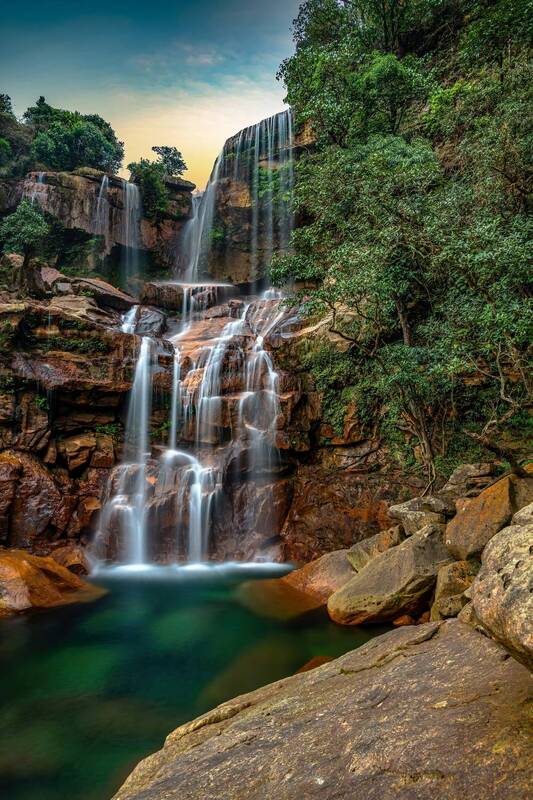 The foreground rocks in the Krang Suri Falls in Meghalaya, India, partially submerged in the clear water, draw the eye towards the main waterfall, enhancing the photograph\'s composition. The vibrant blue waters contrast beautifully with the reddish-brown rocks and lush green foliage, creating a harmonious and visually captivating image. The sunlight dancing on the water and the surrounding greenery adds a magical touch to this natural wonder.