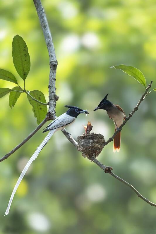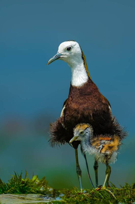 A tender moment between a Pheasant-tailed Jacana and its chick, beautifully captured in their natural habitat. The adult’s striking white head and brown plumage contrast gracefully with the soft blue background, while the downy chick nestles close for safety. The vibrant green foliage adds depth, celebrating the harmonious bond between parent and offspring in the wild.