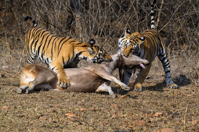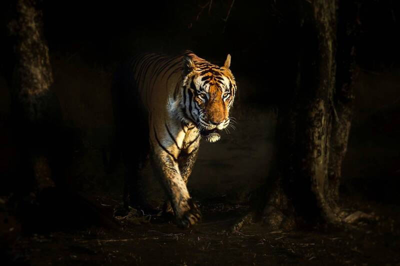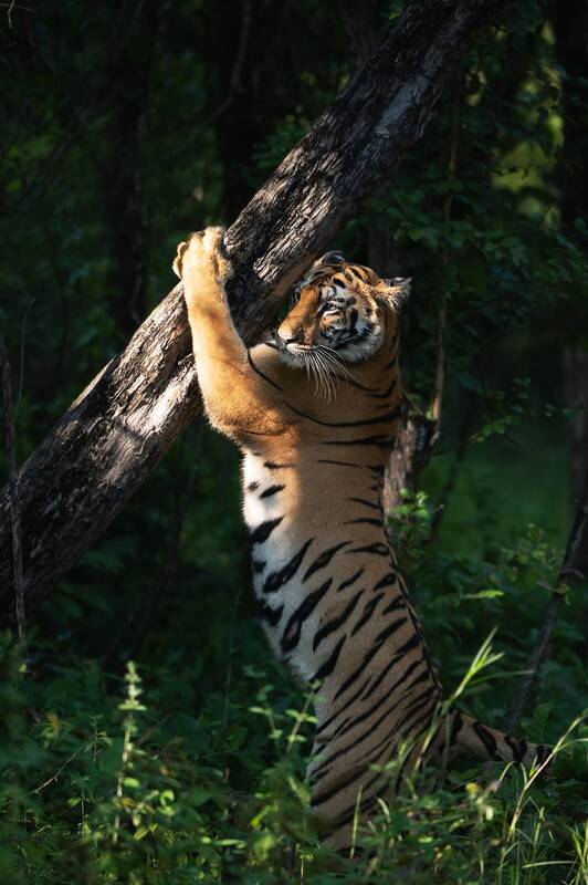 A young adult female tigress on her journey to establish her dominance in the territory was \\\"tree hugging\\\" and \\\"cheek rubbing\\\" to mark her territory. The sunlight on her face made my moment inbetween.