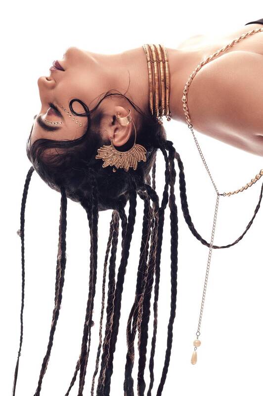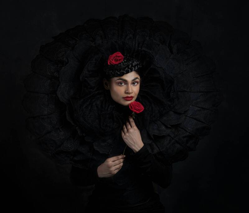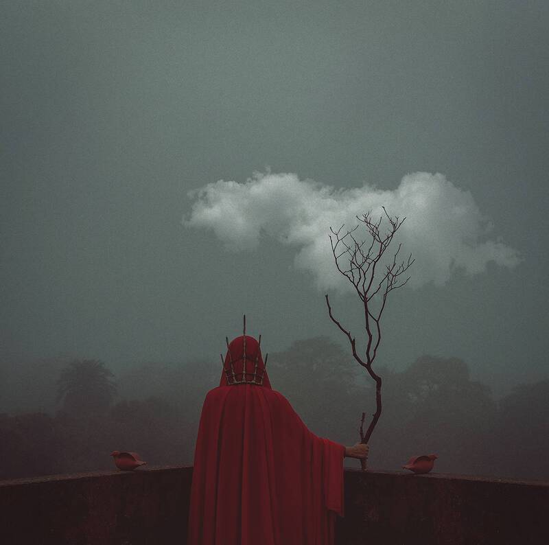 In the photograph titled 'the earth with her ornaments' the crowned woman is the symbol of Mother Nature based on the Sanskrit Panchatattva. The five elements or Panchabhuta represent in the photograph are: Earth which is represented by a dry tree branches , Clouds represent water ; while the branches of the dry tree and the use of clouds represent the ever-flowing cycle of life. The red cloth in the photograph represents fire or life force, air is specifically represented by the earth bird and the two birds represent the continuous breathing of life ; the blue sky in the photograph is the symbol of the Universe or space. The mist that covers the entire photograph reflects the mysteriousness of the magical world.