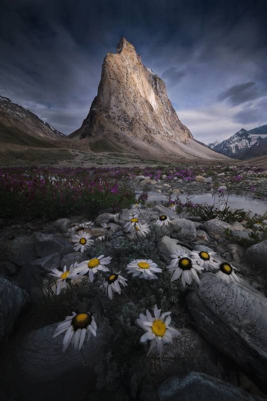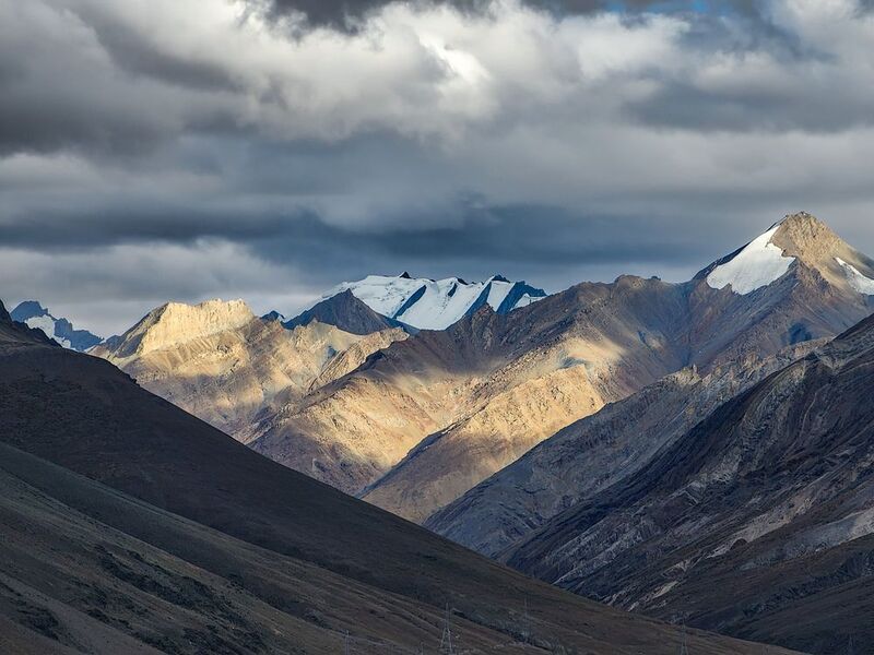 As the sun dipped below the rugged Nun- Kun peaks of Ladakh mountain, the sky erupted in a brilliant tapestry of oranges, pinks, and purples. The last rays of sunlight gently touched the jagged edges of the mountain, casting a warm glow that highlights its grandeur. In the foreground, a flowing river mirrored the vibrance of the sunset, its surface shimmering with golden reflections. The gentle sound of the water flowing over smooth stones creates a serene atmosphere, while the cool evening breeze carries the earthy scent of poplar trees and fresh water. The scene is a breathtaking blend of nature\'s beauty, inviting peace and contemplation.