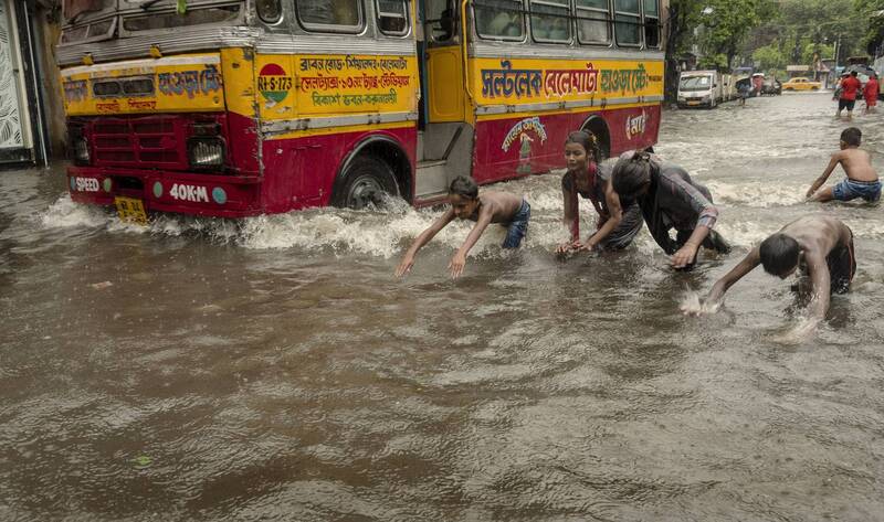 A protester with Indian flag demonstrating against the police in demand of R G Kar rape and murder case. Police throw water gun to the protesters from other side of temporary iron wall on Howrah bridge.