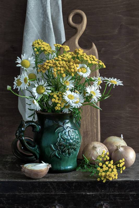 Летом в разнотравье можно насобирать прекрасные букеты из простеньких цветов, например ромашки и пижмы. Вот такой букет в красивом зеленом керамическом чайнике на этом фото является композиционным центром. За ним находятся деревянная разделочная доска красивой формы, льняное полотенце, перевернутая крышка от чайника. Справа от чайника три головки репчатого лука, а на переднем плане слева половинка луковицы, а справа веточка пижмы.