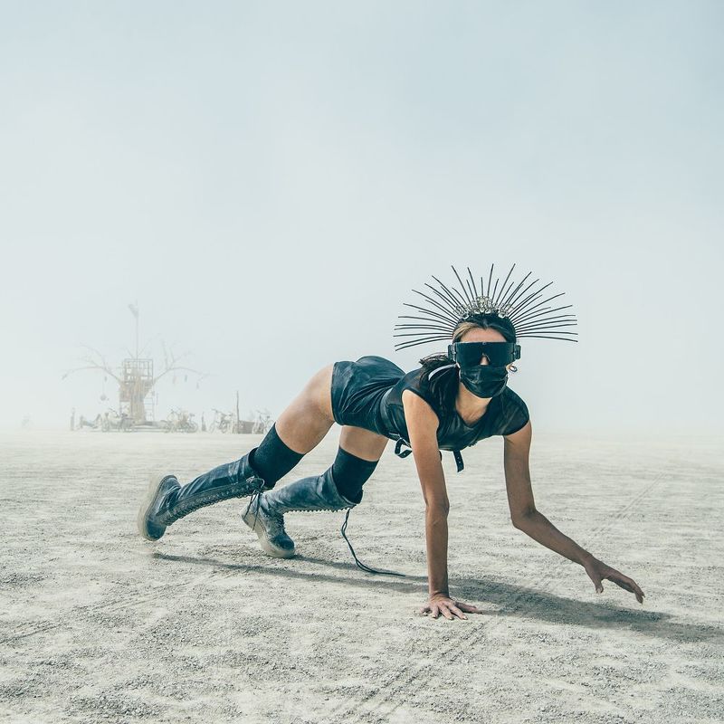 On the endless playa, where dust becomes breath and boundaries dissolve, she channels the Axis Mundi — the cosmic axis connecting earth to sky, self to infinite. Rooted in leather and steel, crowned in obsidian fire, she prowls forward through the whiteout: untamed, unapologetic, alive. Burning Man isn\'t just an event; it\'s the moment you remember you\'re made of stardust and rebellion. This is that moment.