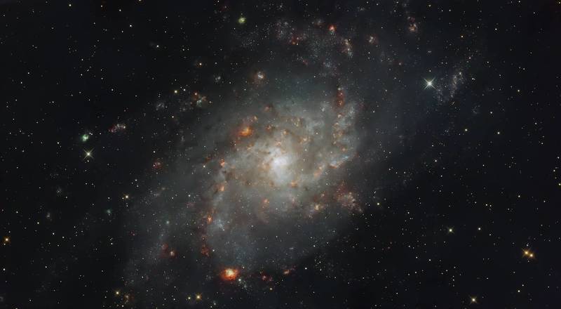 Галактика Треугольника (М33), получена с помощью телескопа системы Ньютона и астрономической камеры на экваториальной монтировке. Накопление около 10 часов в городской засветке (Bortle 6) через фильтр triband.