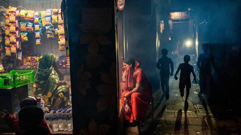An evening scene in the gullies(bylanes/streets) of Varanasi which is the holiest city in India. I had the camera setting correct and I could only get 2 images while these 3 kids started running from the right side of the frame... And the two women sitting on the left made for a balanced composition.