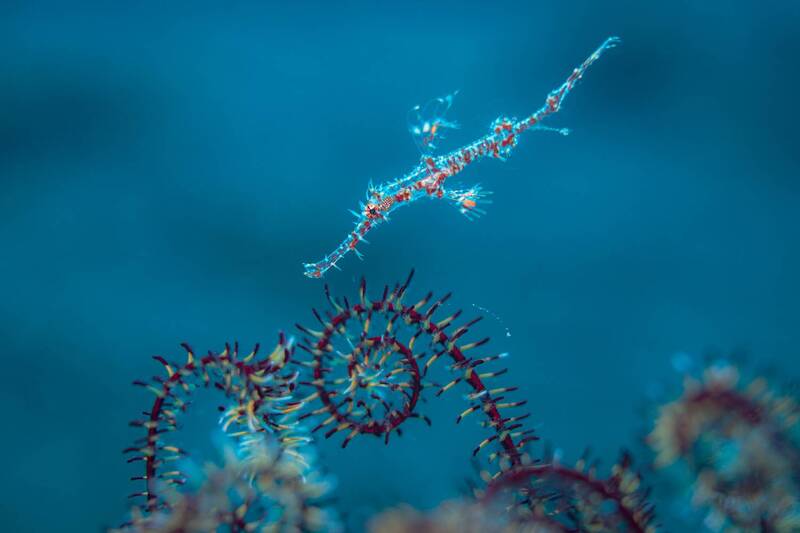 A juvenile ghost pipefish shot during a dive in Tulamben, Indonesia. They were trying hard to blend in with that feather star to hide from bigger animals.