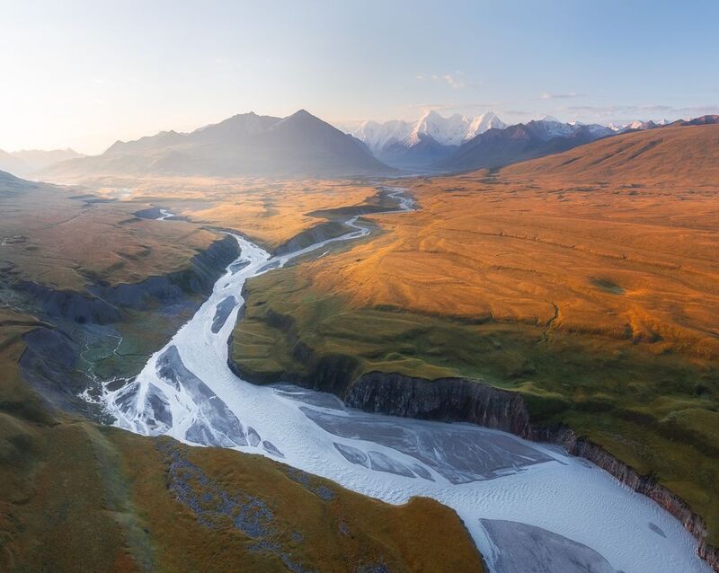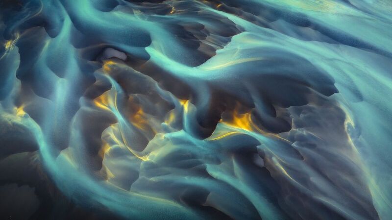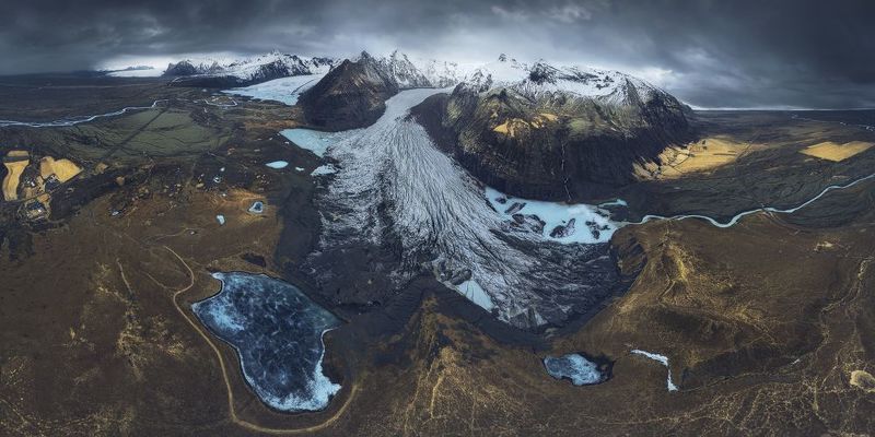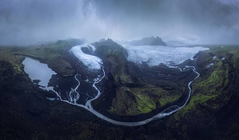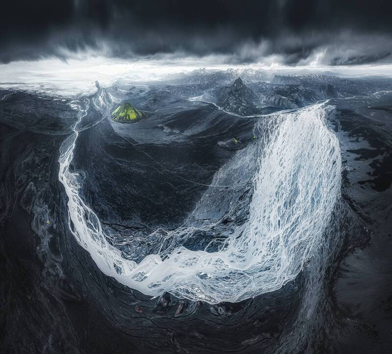 From high above the rugged terrain of Iceland, a breathtaking panorama unfolds, revealing a frozen river of ice that snakes its way through the landscape. This aerial capture showcases the raw beauty of the Arctic, where glaciers carve paths through the earth, leaving behind a tapestry of textures and colors. The vastness of the sky mirrors the immensity of the ice, creating a sense of awe and wonder that is both humbling and inspiring. Inspired by the work of Armand Sarlangue, this photograph captures a moment of quiet contemplation, where the silence is only broken by the whisper of the wind and the occasional creak of the ice.