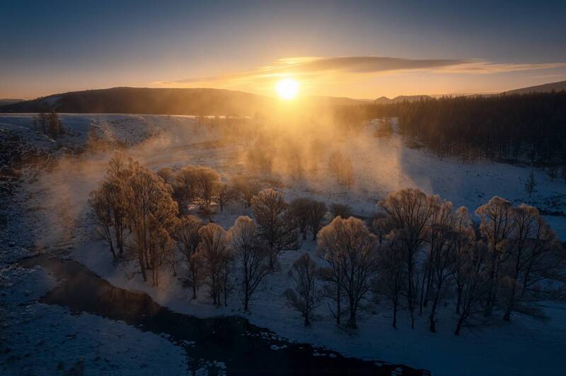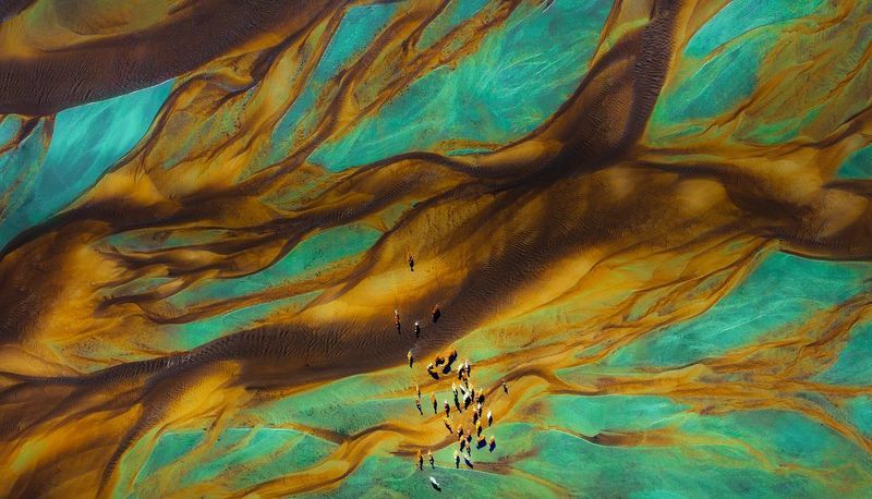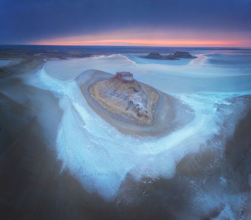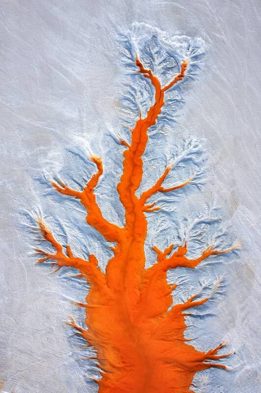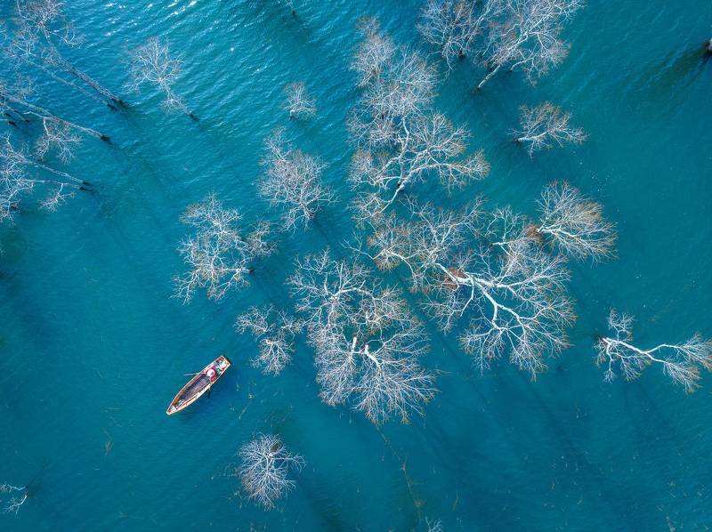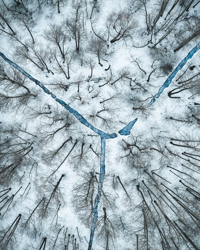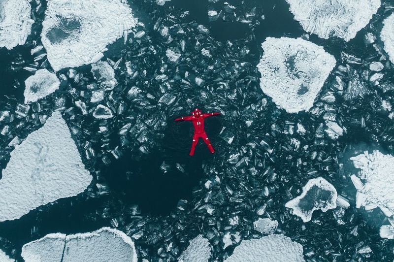The photo is a record of natural structures – the patterns that had formed on the frozen lake under the influence of various weather conditions. When I noticed this amazing pattern, I decided to become a part of this image, at least for a moment. I realized that the human figure would reflect the proportions of the created patterns and would also be a visualization of my attachment and fascination with the natural world. In order to realize my idea, I dressed in a white outfit so as not to disturb the natural composition too much and started posing, while recording the different sequences with a drone. I took the photo in the Drawsko Lake District in North-Western Poland.
