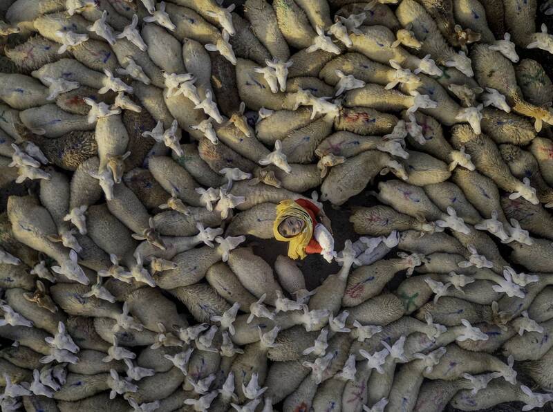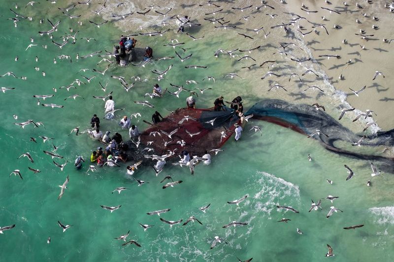Chaos at fish market captured through birds eye view at Chirala, Andhra Pradesh, India.