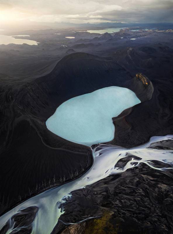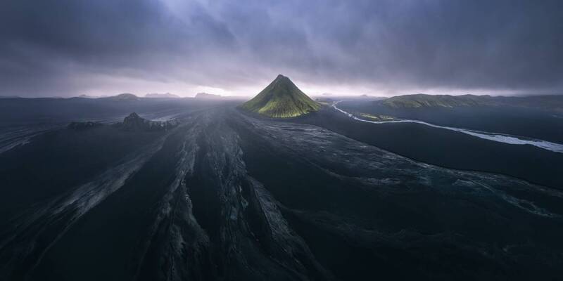 This black desert is actually a barren land caused by volcanic rocks in the highlands of Iceland. It\\\'s like a perfect black canvas, where rivers and moss become the most dazzling brushstrokes. The moss covered Maelifell volcano is like the eye of the earth, gazing at us.