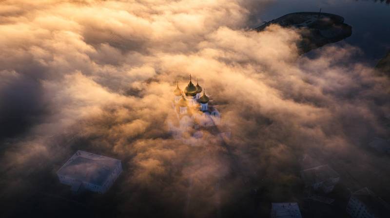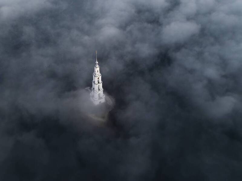 На рассвете небоскрёбы Canary Wharf прорываются сквозь густую пелену тумана, словно острова в бескрайнем море облаков. Эта аэрофотография передаёт уникальную магию утреннего Лондона, где современная архитектура встречается с природной стихией, создавая неземной пейзаж.