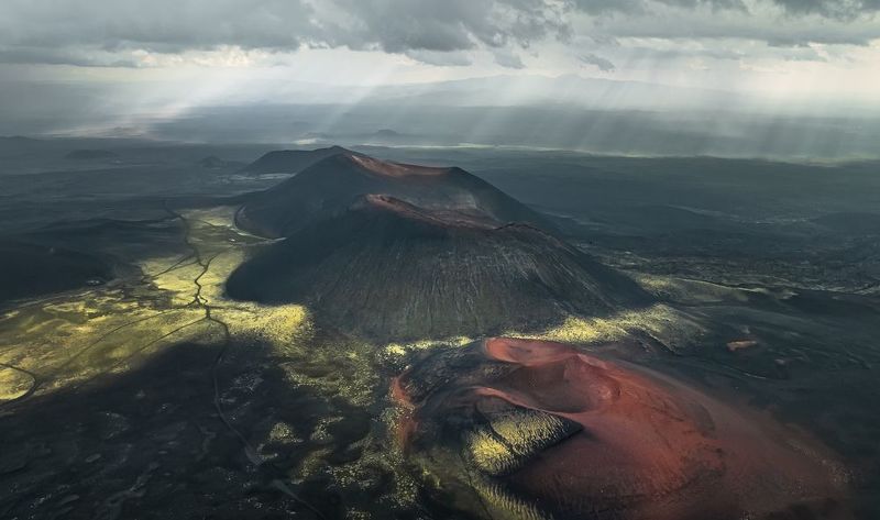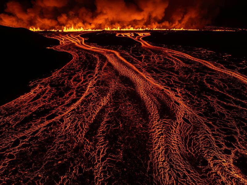 The powerful beginning of the 7th eruptive episode of the 2023-2024 eruption of Svartsengi volcanic system, in southwestern Iceland the 21st of November 2024. A several kilometers long lava flow is developing from a 3,5 km long eruptive fissure visible in the background. The effusive rate of this eruption has been estimated around 1500 cubic meters of lava per second.