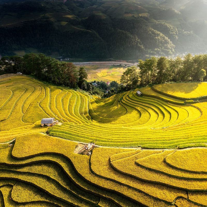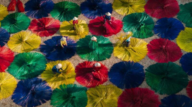 From high above the verdant fields of Vietnam, a breathtaking panorama unfolds, revealing a symphony of human activity amidst the natural beauty of the landscape. This aerial capture showcases the artistry of local farmers, their conical hats dotting the landscape as they tend to their soybean crops. The patterns created by the rows of plants and the workers\' movements create a mesmerizing visual tapestry, a testament to the harmonious relationship between man and nature. A moment of quiet industry, where the beauty of the countryside merges with the timeless traditions of agricultural life.