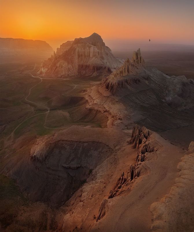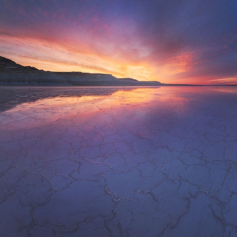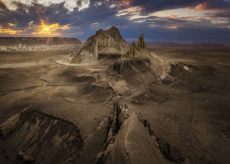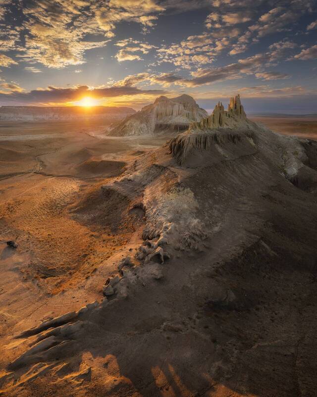 In the heart of Utah\'s rugged landscape, a breathtaking panorama unfolds, revealing a tapestry of colors and textures that stretch as far as the eye can see. This aerial capture showcases the raw beauty of the bentonite formations, their undulating layers creating a mesmerizing pattern across the terrain. The sky is a canvas of ever-changing hues, reflecting the solitude and tranquility of this remote wilderness. A moment of awe-inspiring wonder, where the grandeur of the natural world leaves us humbled and speechless.
