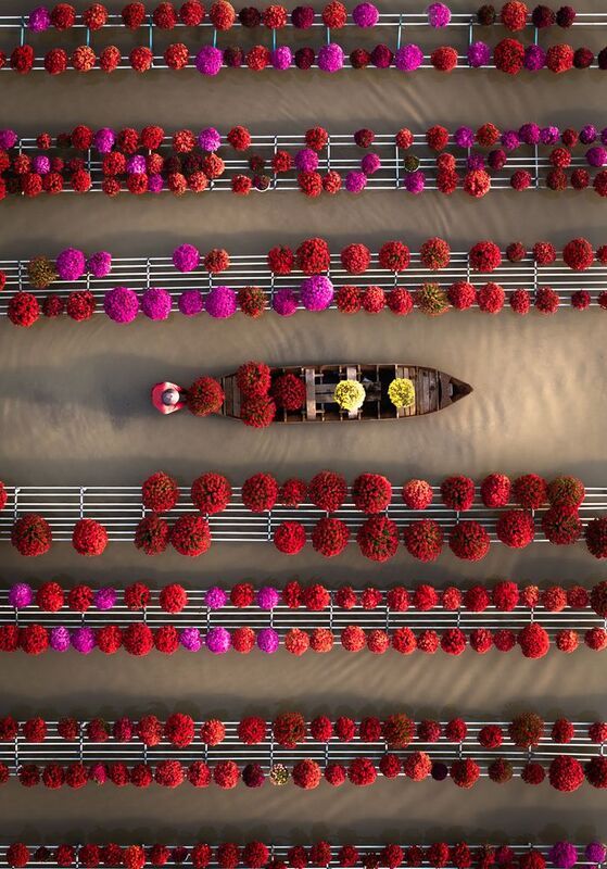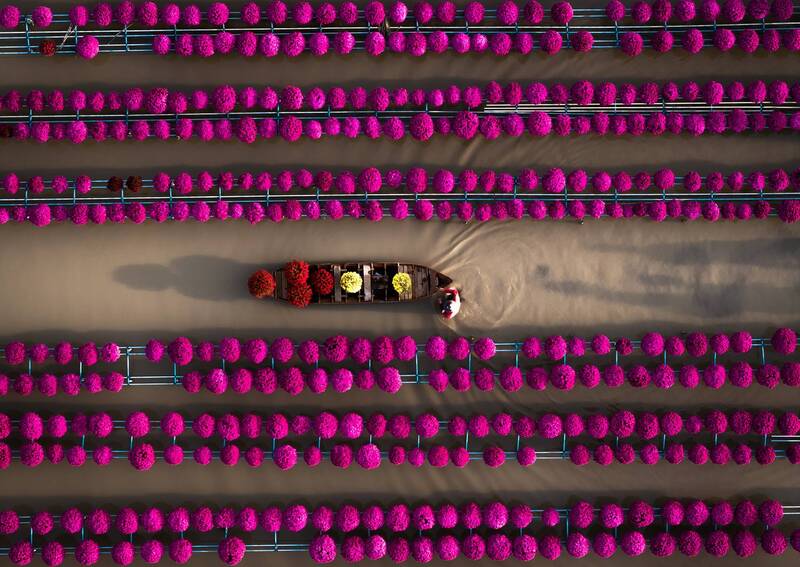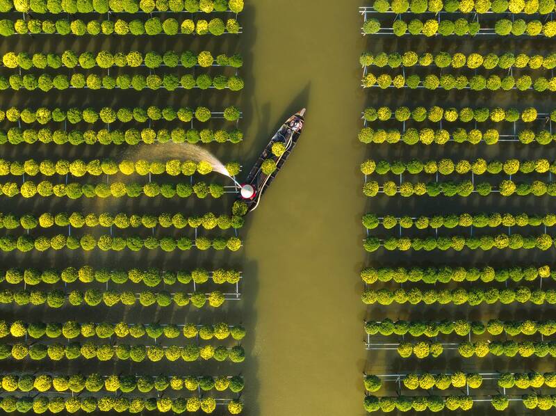 Amidst a vast field of golden chrysanthemums, a lone farmer glides his boat through shimmering waters, nurturing each delicate bloom. The golden chrysanthemums are cradled in pots atop wooden trellises, sway gently above the flooded fields while their golden hues mirroring the sun’s embrace. As Tet approaches, locals purchase these blossoms to display around their homes, filling every corner with the warmth of spring and a festive touch of renewal.