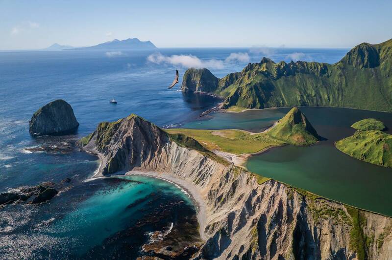 An aerial view at sunset of a mountain by the sea, with warm colors reflected in the water and shadows stretching along the coast, evoking the serenity and beauty of places like Stokness.