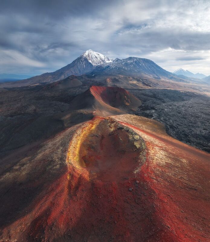 An aerial view of a volcanic crater in Lanzarote, reveals the striking contrast between molten-earth hues and rugged textures on an island shaped by fire and time.