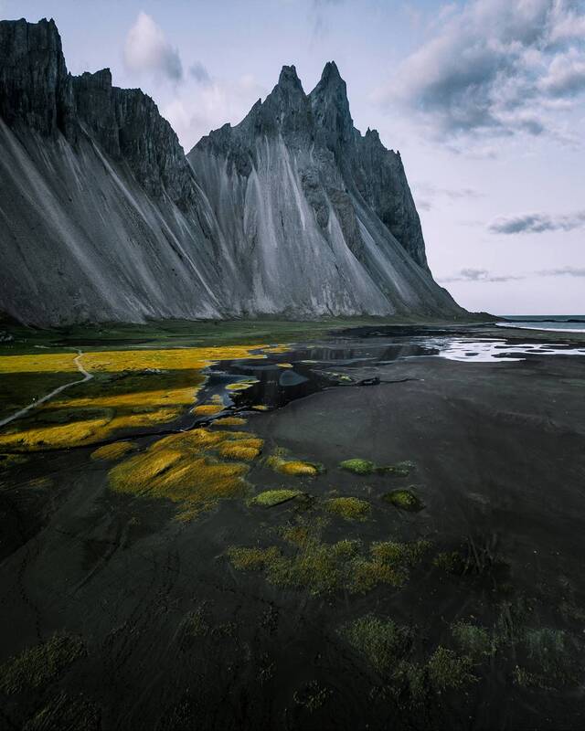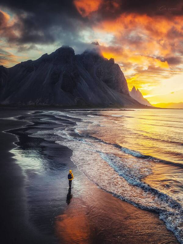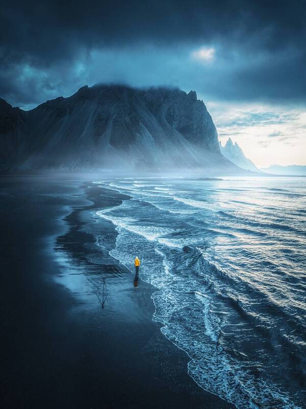 Vestrahorn Mountain appears particularly lonely in the rainy weather. Perhaps it is precisely because of the three-day wait that the blues at this moment has been tinged with a hint of melancholy. Walking alone on the black sandy beach, the world is quiet, as if only the sand and waves beneath my feet are responding to my presence. The faint light in the east slowly rises from the intersection of the sea and sky. The hope for the future has bloomed in the sky.