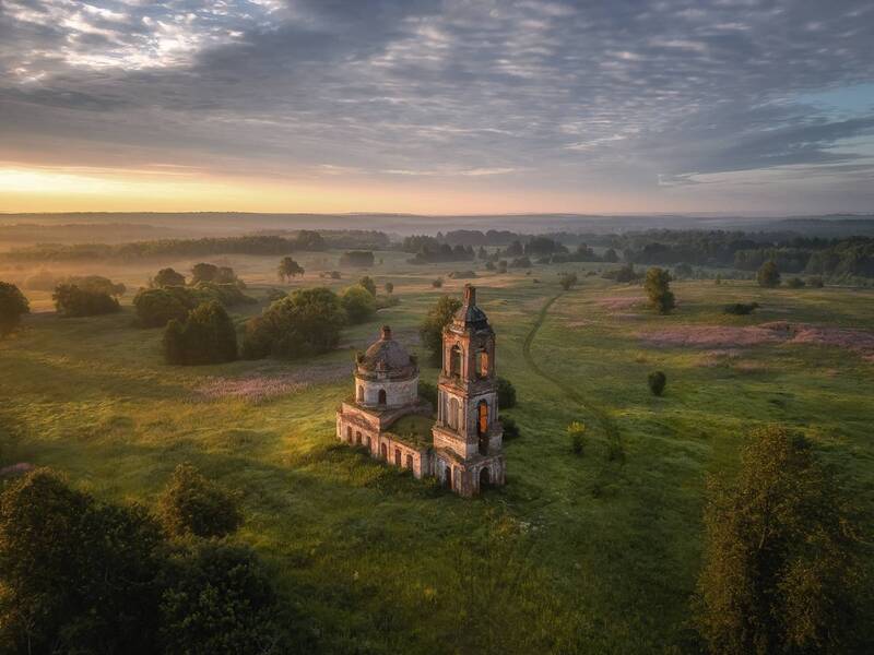 As the first rays of dawn grace the earth, they cast a warm, golden hue upon the tranquil scene of a church nestled atop a gentle hill. Captured in the embrace of morning mist, the layers of fog create an ethereal backdrop, adding depth and mystery to the landscape.