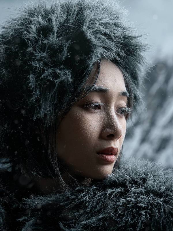 A hauntingly serene winter portrait captures a young woman submerged in icy waters, her damp hair clinging to her pale skin. Her piercing gaze meets the camera with quiet intensity, while the cold ripples surround her, echoing the stark, raw beauty of the season.