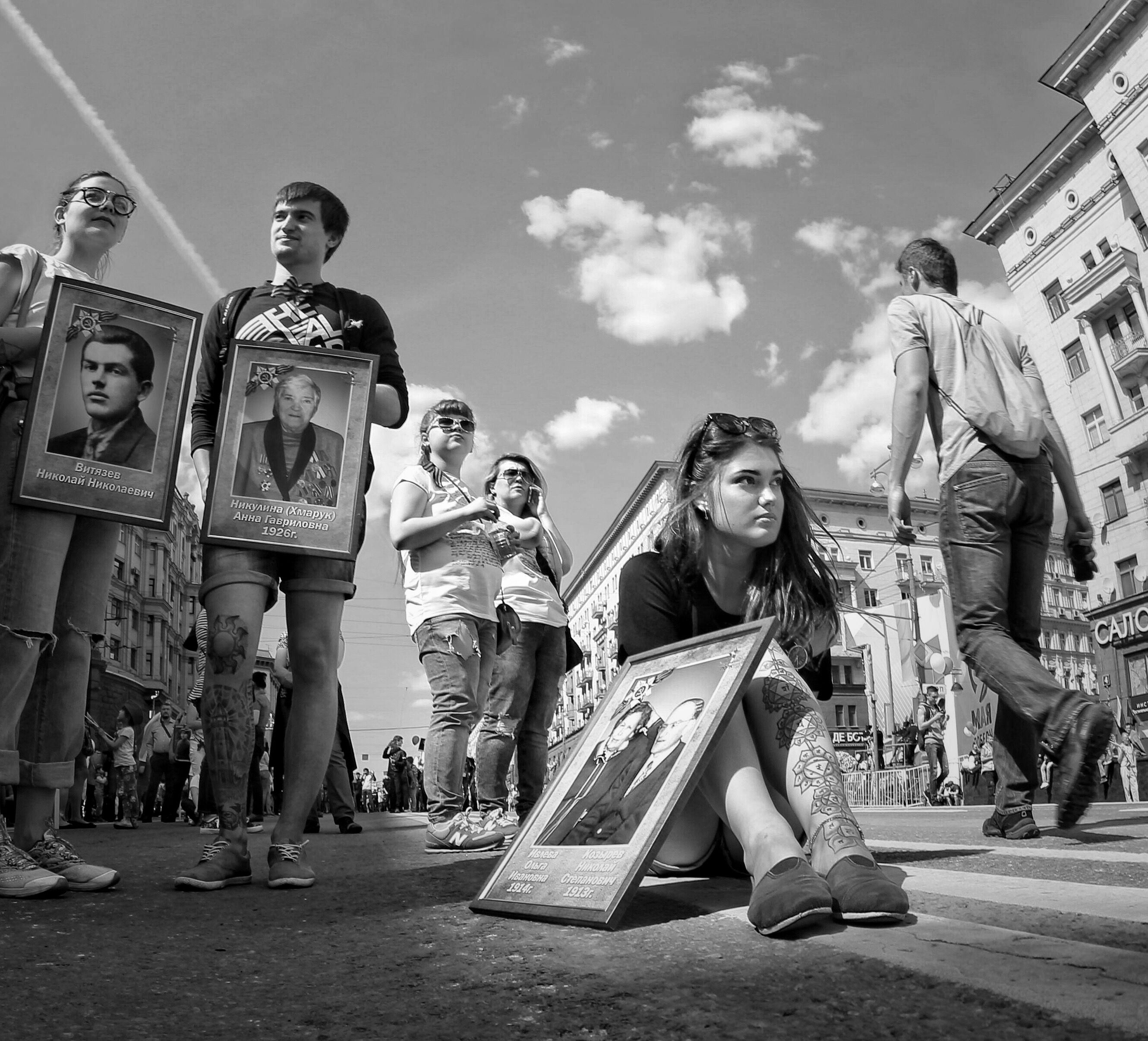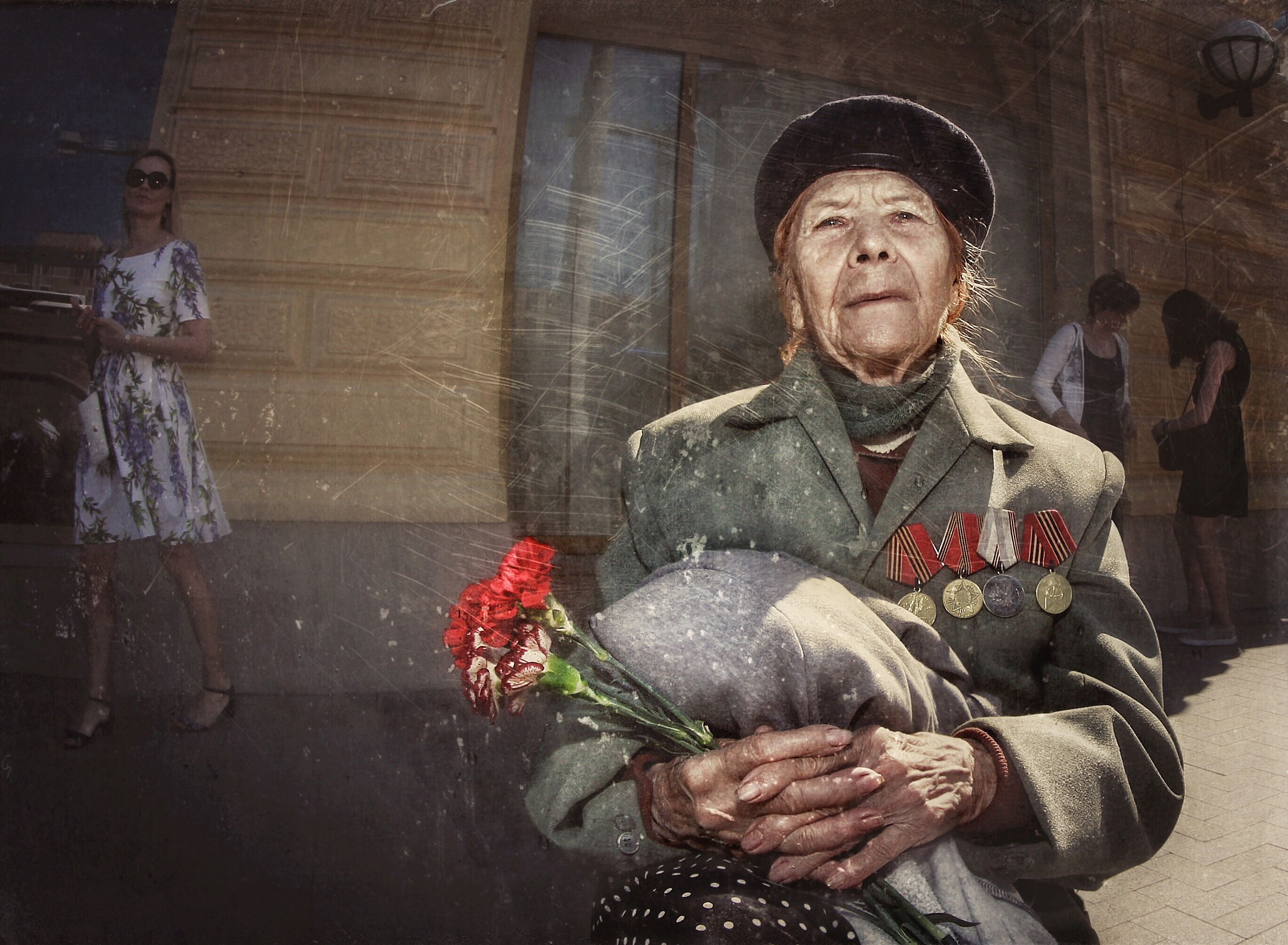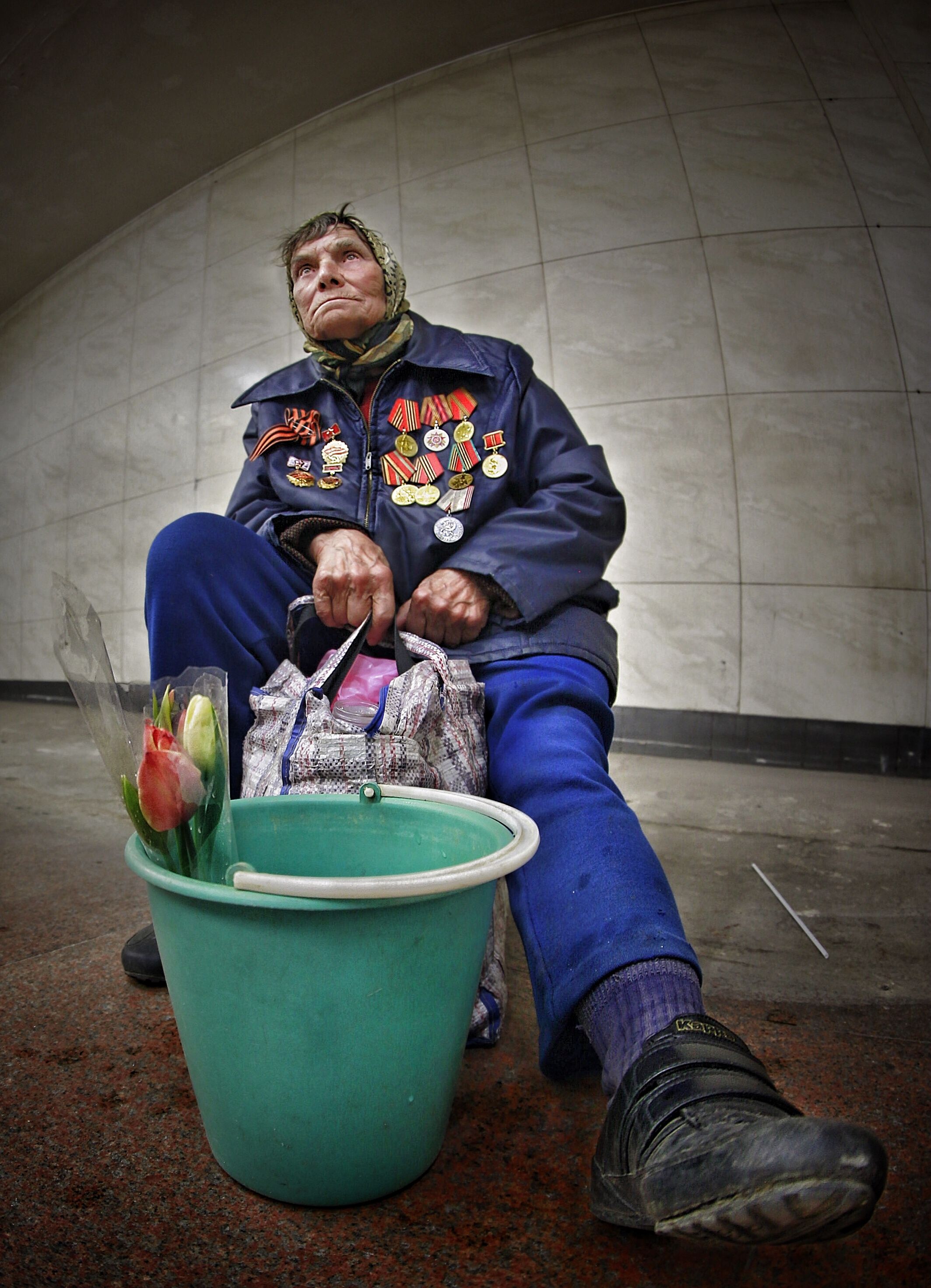 Шел возле крупного магазина , мела позёмка.. И вдруг увидел человека , который сидел возле машины и похоже , что он что то просил , но и чашка для подаяния и сам он уже были засыпаны снегом .. А рядом сним, лежали такие же брошенные всеми собаки .. Сфотографировать спереди не решился, тем более, что сзади было видно , как всё запущенно ... Снимок не участвовал ни в одной выставке, как и я сам - Вы первые.