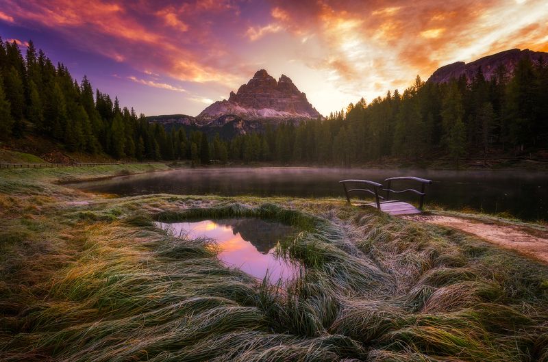 After 3 days with a lot of rain and some snow I managed to get the first sunrise with some light, this is the picture where I captured the beautiful sunrise light over the Tre Cime di Lavaredo with the reflection in Antorno lake, Dolomites.