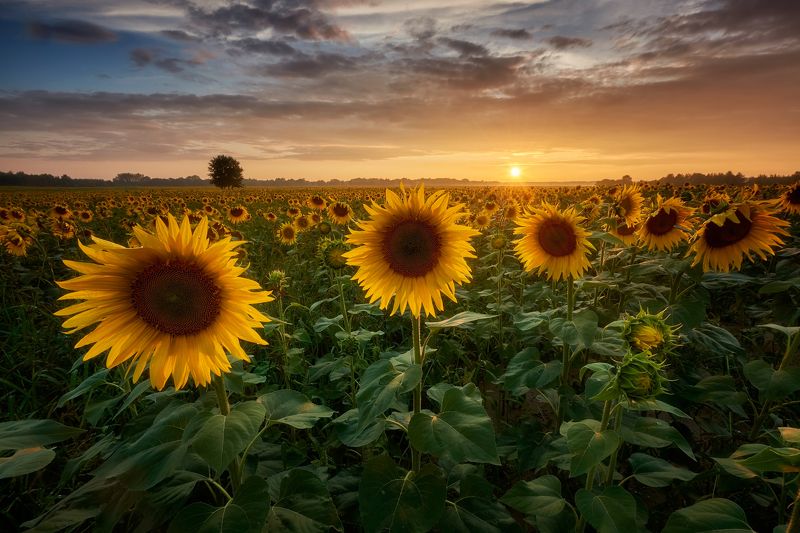 A glade of sunflowers for years I dreamed, I was going to go beyond the borders of the country to immortalize these beautiful plants. This year, thanks to a friend who gave me information that there is such a place very close to my place of residence, I could immortalize it! I just had to wait for the right conditions, which after a few days came. Thanks to the beautiful sunset, a sunflower series was created.