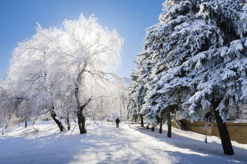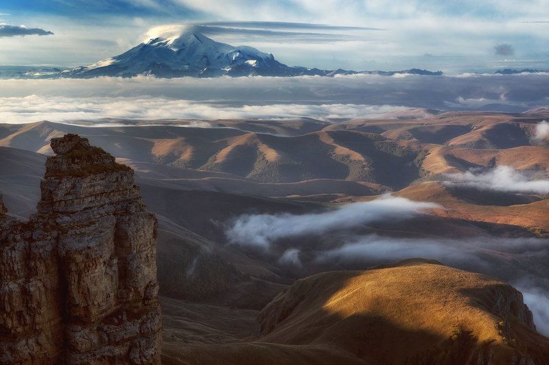 Когда этой осенью мы ехали на плато Бермамыт, оно было практически всё скрыто в тумане. И каких-то особых ожиданий на съёмку не было. Так и спать легли в молочной пелене. Но посреди ночи, когда по некоторым делам вылез из палатки, я даже слегка растерялся. Со всех сторон вроде всё тот же туман, но как-то клочьями. А голову вверх поднял, так там же звёзды! И ожидания появились в тот момент. На рассвете, туман упал чуть ниже или это всё же облачность, скорее, просто мы ведь сильно наверху. В общем понеслось. Вернее, мы понеслись в разные стороны. Сначала, первые лучи солнца облизали поверхность плато и это сразу же дало много сюжетов. А потом я услышал от Андрея - "Он открылся!". И вот тут действительно началось. Да, если кому не понятно. Он - это Эльбрус.
