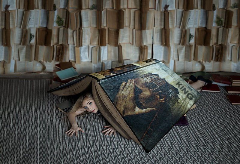 Снято в студии, где вся стена увешана книгами, ну и возникла мысль, что если одна из них упадет. А неожиданно кого-нибудь накрыть может только Стивен Кинг. В итоге большим ватманом накрыла модель, а дома уже доснимала отдельно книгу.
