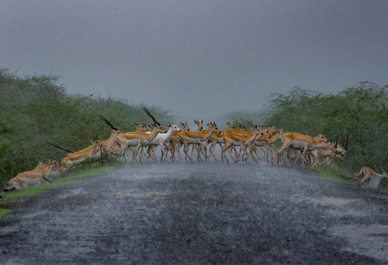 In the early morning, one of the black buck was roaming in the dried grass land. It was the amazing moment, the color of black buck was also mixed up in the surrounding.