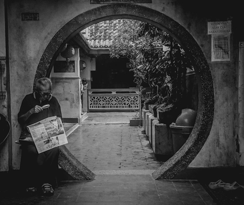 I took this photo with my xiaomi redmi note 4, when i see an old man reading Quran in front of window i just think this is great moment and great opportunity to take a shot, but i didnt bring my camera so i just take it by my smartphone and edit it with photoshop mobile.