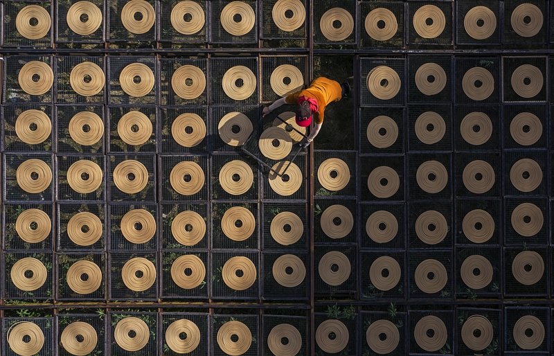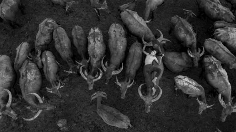 Capturing the energy and dynamism of that climatic moment, accentuated by his strong facial expression, with his mouth wide open and eyes laser focused on the ultimate goal, and the splash of the muddy waters, brought into force by the power and speed of the raging bulls, one can observe several “V” shapes-the inverted “V” between his arms and head; the shape between legs; and thirdly, the “V” formed by the rope connecting the two bulls adding a dramatic, sharp geometry to the shot, displaying the rider’s energy and skills in reigning over the heavyweight duo, running in perfect symmetry.