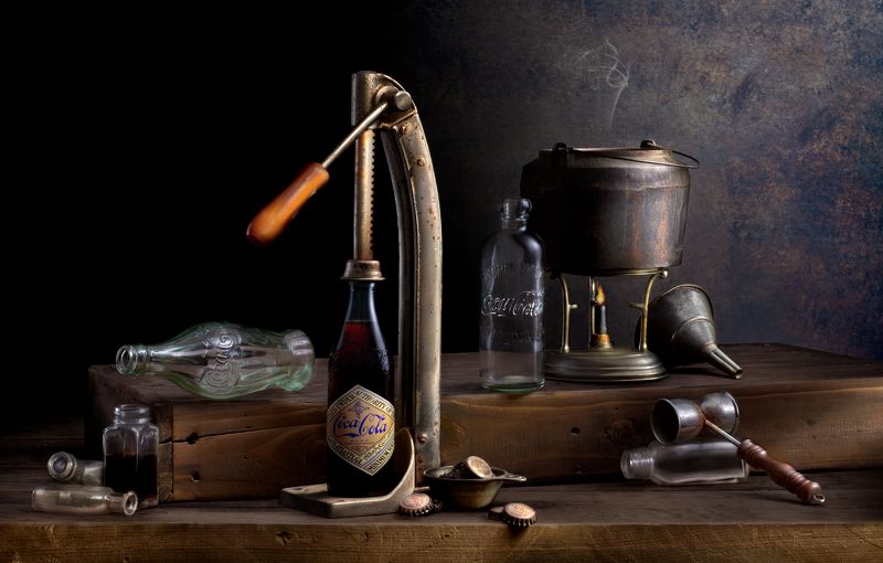 Three-legged kettles made his invention possible. I am not sure of the exact setup of his laboratory, but this is how I imagined it to be using antique props I found locally. This image was made using Harold's Sculpting with Light Technique.