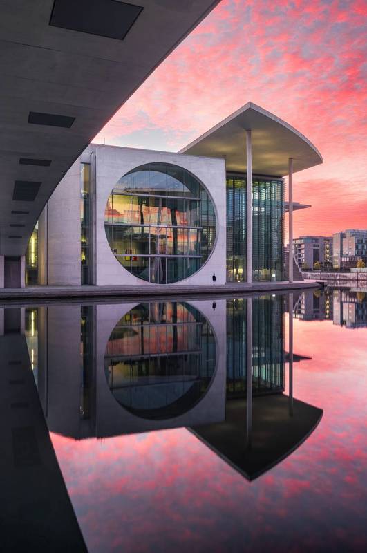 My favourite location in Berlin, Marie-Elisabeth-Luders-Hau. Photo blend of modern architecture with element of street; person in the centre and beautiful morning sky as element of landscape photography.