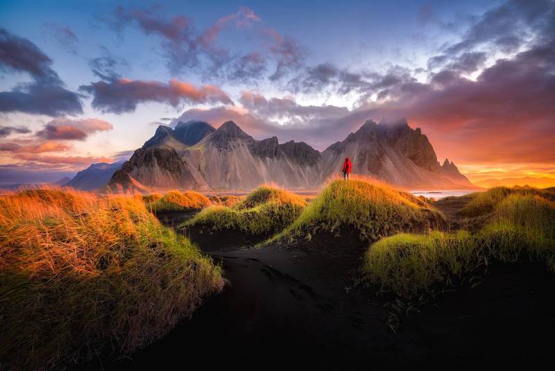 catching Vestrahorn in Iceland is always an exciting experience. In the photo, a unique visual spectacle opens up: the majesty of the mountain is reflected in the tide, creating an extraordinary atmosphere.