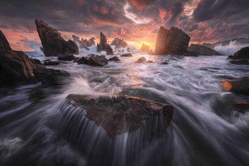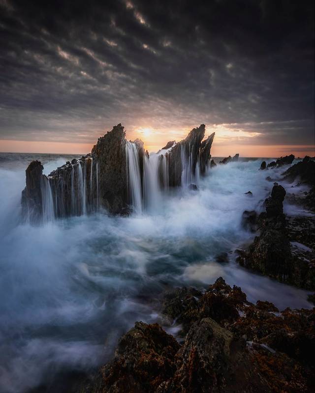 I\'ve been waiting for a couple years to get the sun straight between the rocks. This rocks formation is called \"Shark Teeth rocks\" located in Sumatera island, side by side with Indian Ocean.