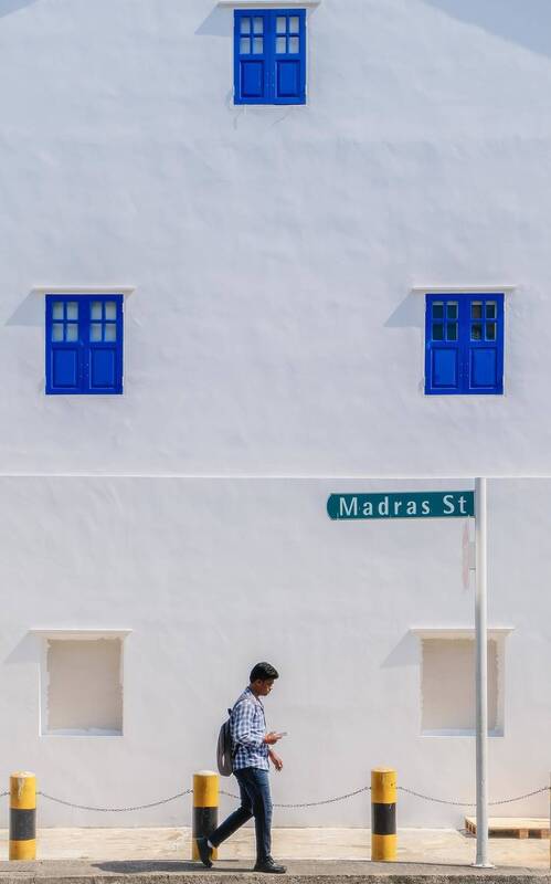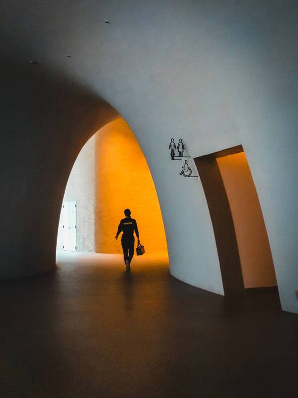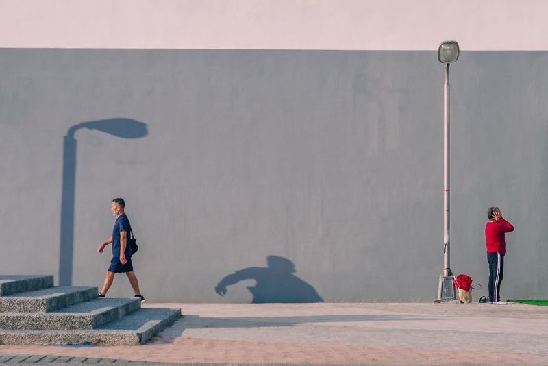 In this street photography, the silhouettes of pedestrians walking towards the light source form an intriguing echo with the male and female symbols on the wall, as if the human symbols are also moving forward. The fusion of people, geometry, light and shadow resonates into a moment of reverie.