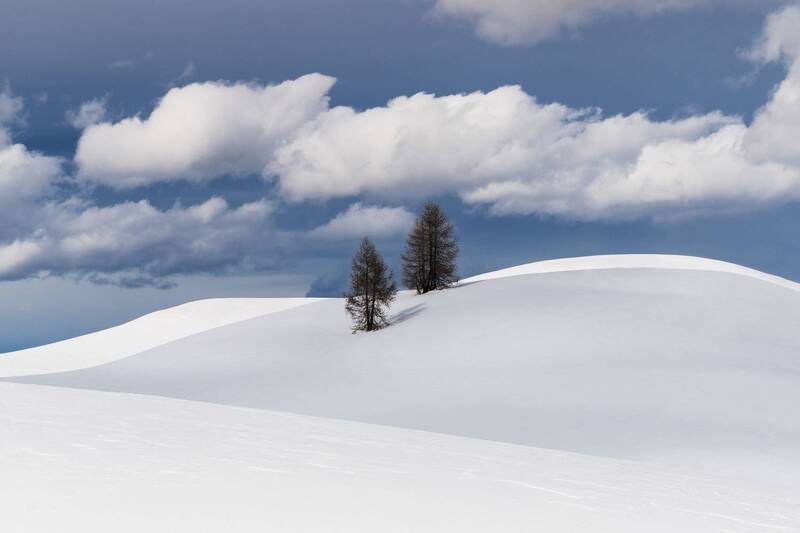 The photograph was taken in late winter 2024 in the Dolomites near the town of Arabba. It captures a delicate play of light and shadow across the peaks, transforming snowy plains into the illusion of shifting sand dunes. It represents an emptiness where one can stand out and discover a sense of fulfillment.