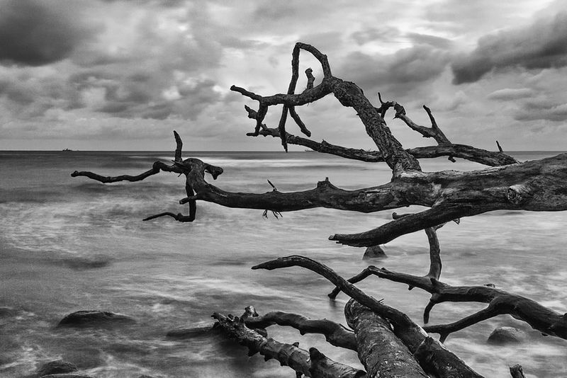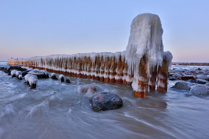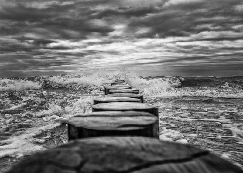 Гроза над Балтийским морем. На переднем плане старый деревянный волнорез, медленно уступающий в противостоянии с природой.