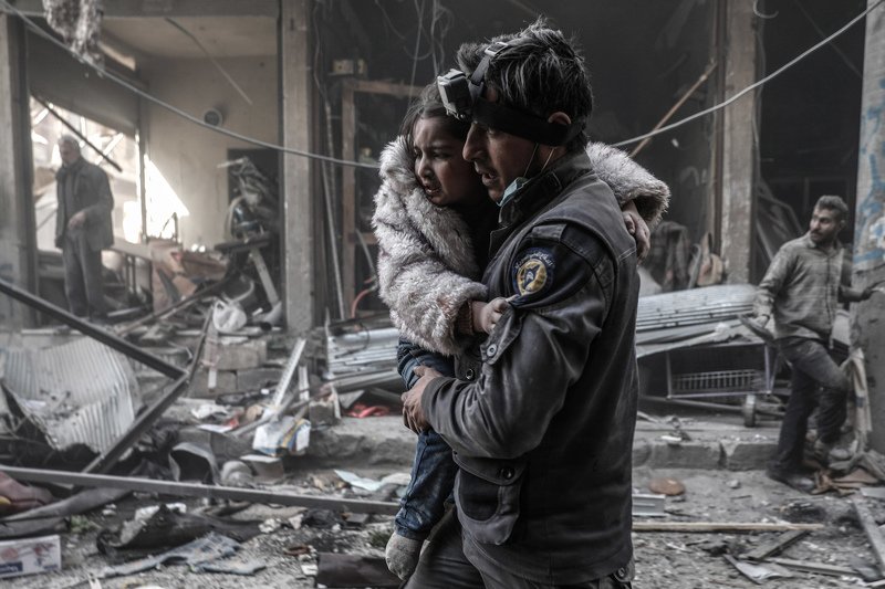 This picture shows a member of the Syrian Civil Defence volunteers, also known as the White Helmets, carries a wounded girl amid the rubble following reported government airstrike on the rebel-held town of Douma, on the eastern outskirts of the capital Damascus, on February 25, 2017.
