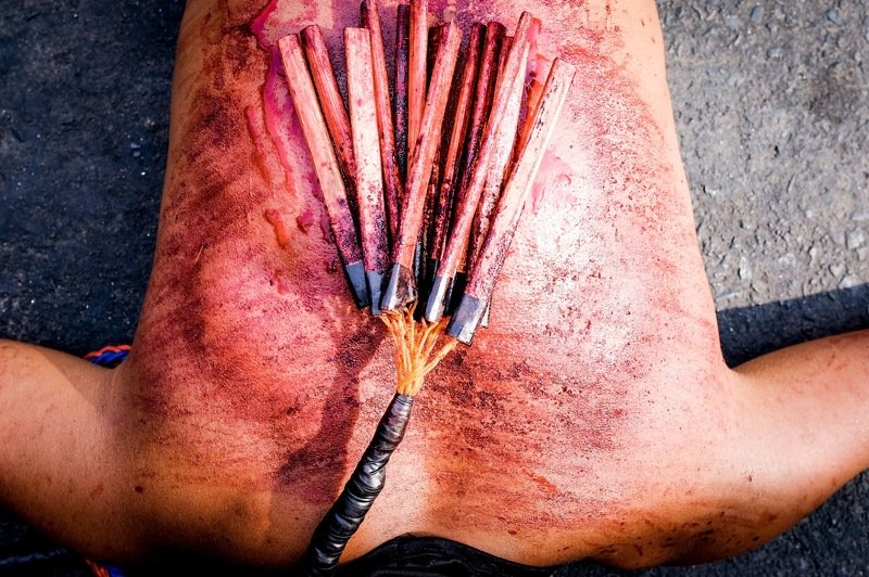 One popular form of Panata for Filipino Catholics is to whip their backs in flagellation until the skin bleeds. They walk the streets with a crown of thorns placed on their heads. Other devotees have themselves crucified on wooden crosses using steel nails.