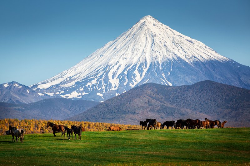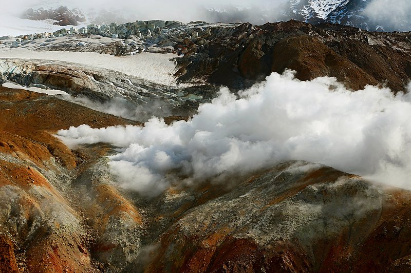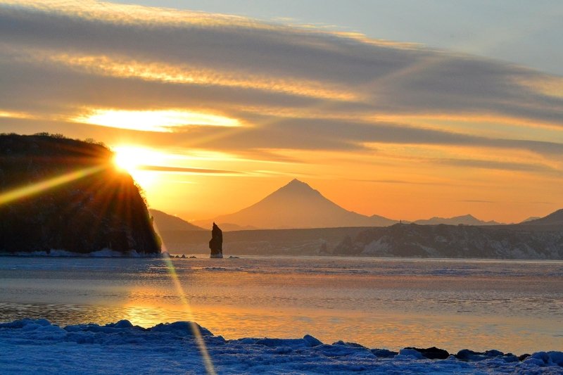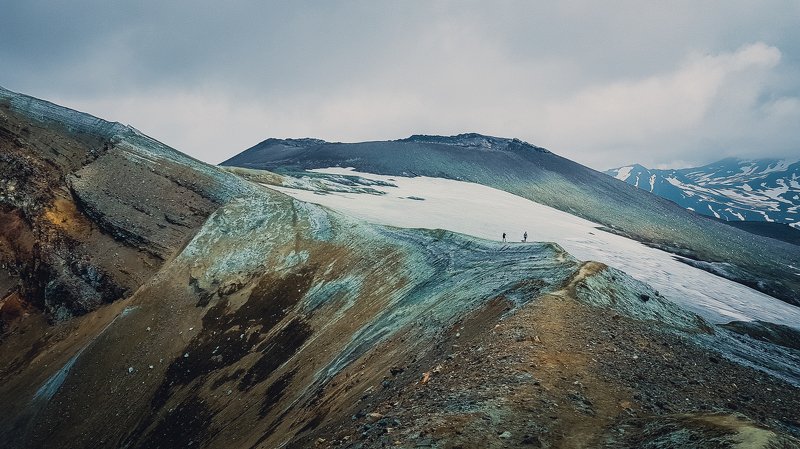 Для того, чтобы подняться на вулкан на рассвете, мы начали восхождение в час ночи из базового лагеря. Успели за полчаса до восхода солнца, передохнули, попили чай и край солнечного диска показался из-за горизонта. У меня было несколько минут. Дрон помог мне выбрать такой ракурс, который не получить иным способом. Соседний вулкан Корякский залило рассветными лучами и я подбежал с пультом в руках к друзьям, любующимся открывшимся видом. Был сильный ветер, до 16 метров в секунду в порывах, но аппарат выдержал испытание.