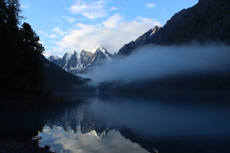 Фотография была сделана 16 августа 2018 года в долине Актру на Алтае. На снимке запечатлён ледник Большой Актру и вершина Актру в синий час и снятый сразу же после него, не перенося место съёмки и не трогая камеру, стартрейл, сложенный из 150 кадров. После чего снимок ледника и стартрейл были наложены друг на друга с использованием яркостных масок в Photoshop. Именно поэтому exif-данные пусты, но в качестве доказательства своего авторства,вышлю raw-файлы с оригинальными exif-данными по требованию.