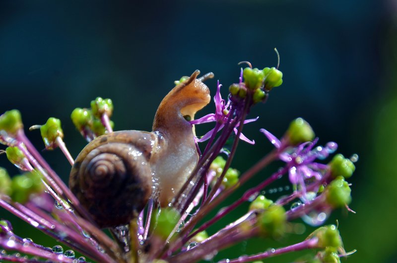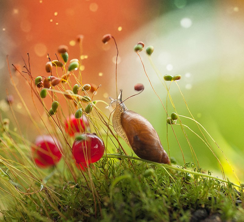 как описать в двух словах мои приключения с этой улиточкой? )) Она сама пришла ко мне на даче, прошла через тяжкие испытания работы моделью - тонула в пруду, когда я хотела сфотографировать ее, плавающей на листочке, уползала от ягодок в дальний угол мха, поворачивалась ко мне раковиной, а не глазами и т.д.))