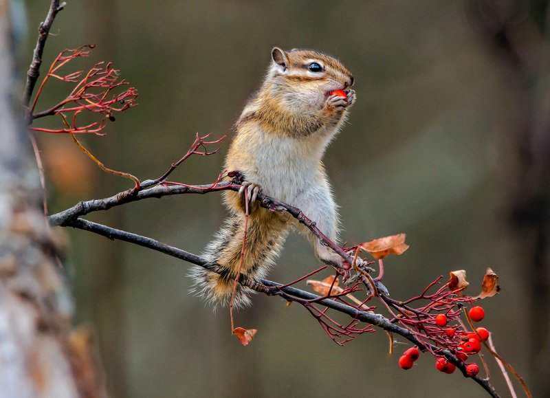 Урожай рябины выдался в этом году скудный, поэтому у бурундука каждая ягодка на счету.Я с интересом наблюдал за зверьком, стоящим на тонкой веточке,раскачивающейся на ветру, на двух лапках и набивающим защечные мешки семенами рябины. Зима у нас долгая, припасает зверёк до 6 кг орех и семян. Летнего жира на всю зиму не хватает, приходится периодически подкрепляться запасами.